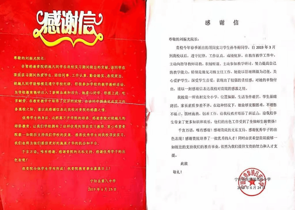 新学期伊始,马克思主义学院分别收到了两封来自宁阳蒋集镇吕庄小学和宁阳第八中学的感谢信。感谢信字里行间充满着两所学校对金年会官网顶岗实习学生的钦佩之意和感谢之情。