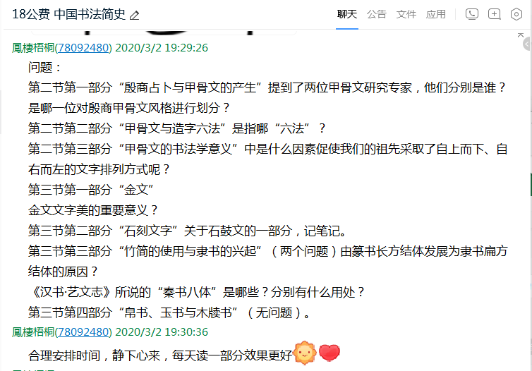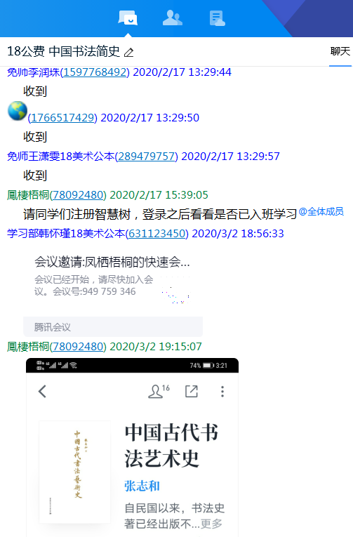 经过第一周的视频学习,同学们对于书法的基本知识有了初步了解,第二周时我调整了授课方式。在学生没有教材的情况下,我搜寻方便同学们阅读的可靠资源,利用“微信读书APP”查找到电子书《中国古代书法艺术史》(张志和著)。此书图文并举,从目录到书写顺序,包括谈及的内容和主要观点都与我们的教材《中国书法史》(黄惇、金丹等著)极为相似。不同之处也有,教材中概括性内容居多,本书则多了些论述以及旁征博引后的客观评价性语言。我定好大致每周一章的计划,提前将重点知识圈注并以问题的形式发给同学们,让他们带着问题读书,并尽可能自己总结读书要点做好笔记。同时,我也将教材中的重要知识点拍照发到班级QQ群,再进行详细的讲解。此时依托腾讯会议APP进行授课任务,先后注册两个账号,保持手机和电脑登录。电脑主要用于讲解知识时“分享屏幕”,手机端可以站在学生的视角查看上课效果,也便于对比两本书中讲述的知识点。
