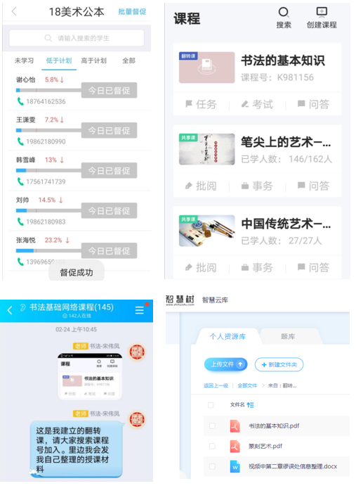 《中国书法简史》是一门理论讲授为主导的课程,老师照本宣科读上两节课,是费力不讨好的做法。在上课第一周,我选择智慧树平台提供的课程——《笔尖上的艺术——书法基础与赏析》中的绪章以及第一、二章节内容,选择此部分的原因有三:一是其对书法字体演变进行介绍,使同学们对书法史的发展能有最基本的认识;二是视频中教师能够随时看到学生的学习进度,对于未达到学习进度的同学有一定的监督机制;三是视频长短合宜,能够让同学们保持一定的学习热情。为了保证学习质量,我还要求同学们进行提问,提问的内容主要针对视频中讲解不清晰或者学生理解不透彻的部分,以此增强学习记忆。同时,建立自己的翻转课堂,上传、分享学习资源,我还应用腾讯会议APP在线与同学们进行交流,针对视频中提及信息繁杂、不详细和错漏处进行补充更正。