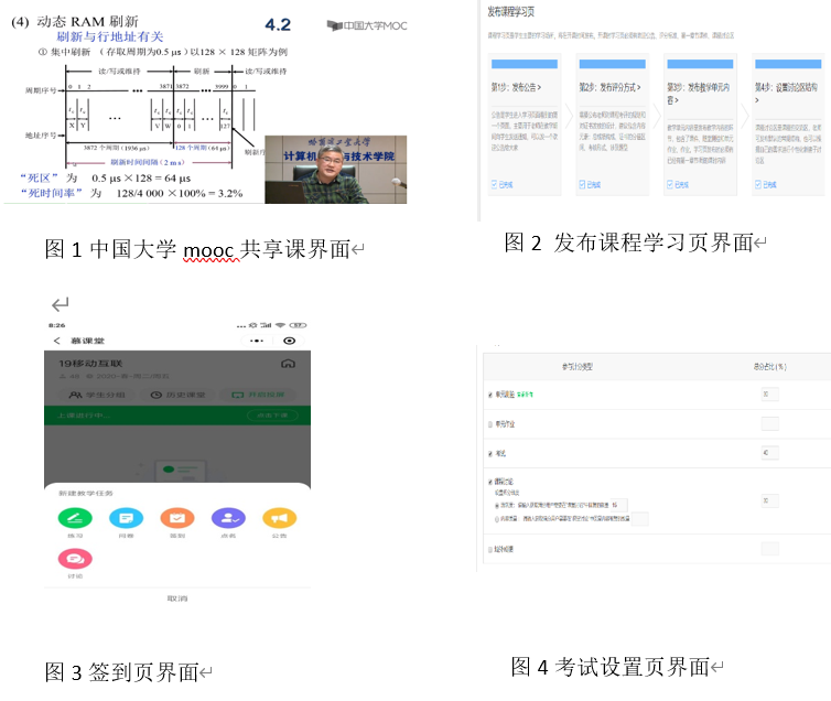 中国大学MOOC平台的在线学习,其优势在于共享课(见图1)优质教学资源可以不受区域的限制被充分共享,促进学生的全面学习,学生可以根据自己的理解程度,有针对性的反复观看某些知识点或跳过已掌握知识点,实现学习时间及听课内容的自我控制。通过发布课程学习页(见图2),老师可以发布公告,发布评分方式,发布教学内容,设置讨论区等。在此平台完成签到(见图3),作业,考试的布置(见图4),基于大数据的学习分析技术能及时促进教师完善和改进教学内容,帮助学员自我调整学习计划和学习方法。