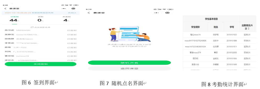 班级QQ群是师生沟通交流的主要工具,课程的共享文件、通知、课前组织都使用QQ群完成。开课前10分钟时,在QQ群里,组织同学们签到(见图6),为了防止学生开小差,可以随机点名(见图7),在后台都有统计(见图8)。