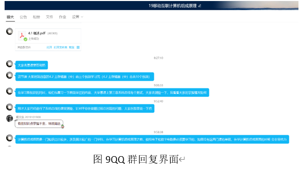 通过学生的预习以及课前讨论,发现学生预习时遇到的疑点、难点问题,通过总结归纳,可以更好地提高在线授课的质量在线教学应以学生的自主学习为主,在线授课时间一般控制在45分钟左右。课程讲解主要围绕课程的主要内容和学生在预习时遇到的问题,以及在看共享课视频中遇到的问题进行讲解,分析重难点,紧紧抓住学生的注意力,辅之以必要的提问,综合运用PPT、电子教材等加深学生对知识的理解和记忆。以下为在线授课结合QQ群里的问题答疑界面(见图9)。