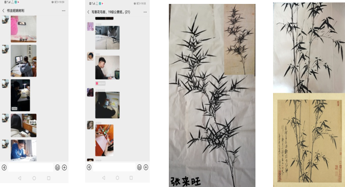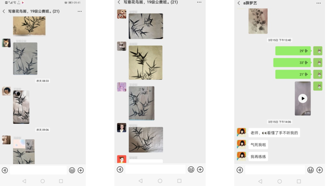 一、对于专业技法课来说,在线授课的难点在于学生的接受程度及学生的回馈反应,我第一周的课是专业技法课—写意花鸟,教授的学生是从未接触过国画的初学者,那么课前的准备工作尤为重要,包括学生在画具上的挑选,在上课的前期就要准备充分,同时准备课前预习,把一些绘画资料提前发到班级学习微信群里,督促同学做好课前准备,保证课程能顺利进行。教师的课前准备也不能有半点马虎,我会提前部署好几周的课程进度计划,每一周都按计划要求进行,准备工作做得充分,后面的教学才会事半功倍。