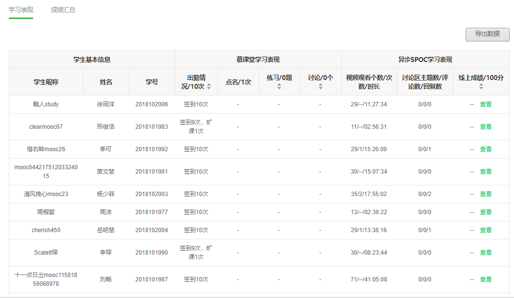 对学生进行学习评价是教学过程的重要环节,线上教学也不例外。考虑这种学习方式的特殊性,学习评价分为课堂同步学习评价及课后学习效果评价。课堂同步学习评价主要考虑学生的签到情况——有误迟到早退旷课现象以及在线学习时长数据(如图10),确保学生按教学进度完成每一次课的学习任务。