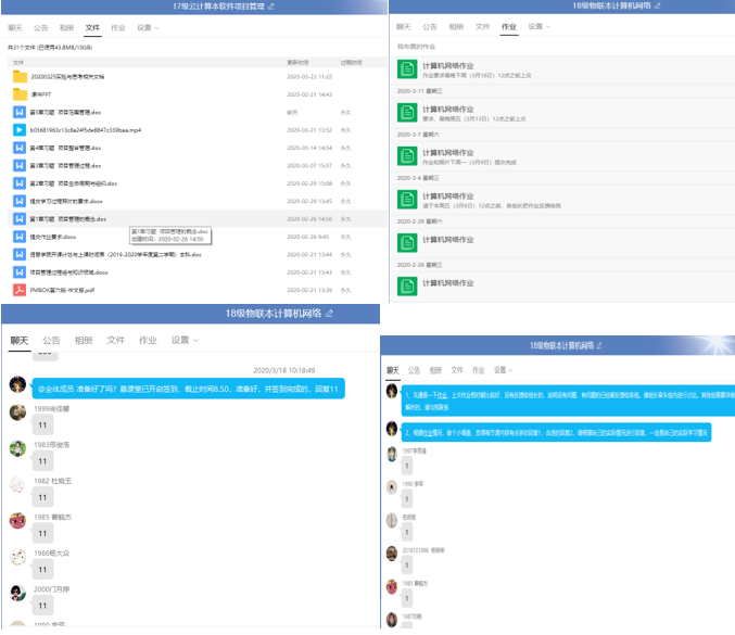 QQ群是师生沟通交流的主要工具,对每个班都建立了QQ群里。课程的共享文件、通知、作业以及问题反馈等都使用QQ群完成。上课前10分钟在QQ班级群提醒同学们即将开始上课,并开启微信小程序“慕课堂(中国大学MOOC课堂辅助小程序)”组织签到,根据学生的发反馈进行下一指令的执行。