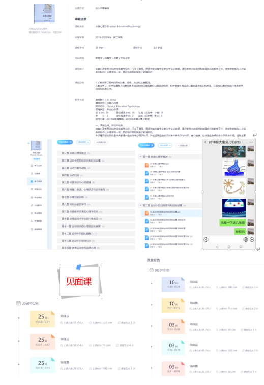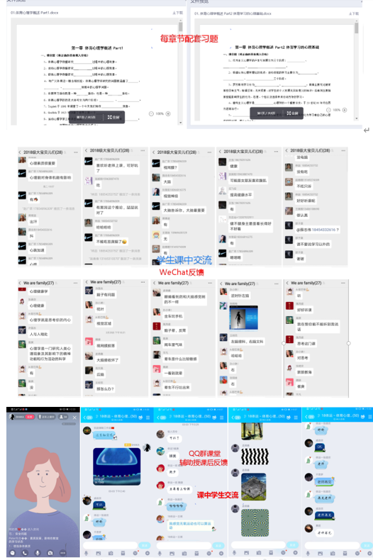 利用智慧树在线学习平台,建立翻转课堂,以见面课为主,QQ群课堂为辅。正式开课前将本课程学习资源、作业上传,并按周次发布,以供学生在线学习。除此之外,考虑到2018级体育舞蹈专业的学生都是文科生,生物基础较薄弱,而生理又是心理学的基础,故利用QQ、微信的方式发放相关学习资源。由于在线教学无法与学生直面交流,我便通过QQ、微信与学生进行交流,询问他们有没有听懂、哪些地方存在疑惑。把他们的问题记录下来,对于普遍性的问题,通过QQ群课堂或会议的方式进行解决;对于个人的问题,通过语音聊天等方式进行一对一解决。