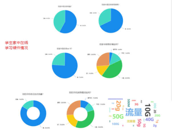 如图所示,虽然近半数的学生家中没有电脑,但所有学生都有智能手机,能够满足在线教学所需的基本硬件环境。68%的学生家中有宽带网络,76%的家中WiFi环境,88%的学生家中信号一般、好或很好;84%的学生有手机流量包月,手机流量集中在10G、20G、40G、50G、100G和不限量,其中80%的学生手机移动信号一般、好或很好。调查可知,绝大部分学生在设备与网络配置方面课保证网课的顺利进行,对于即时信息接收不好的学生,我会将学习资料发送至微信群、QQ群,便于他们学习,并随时在线指导答疑。