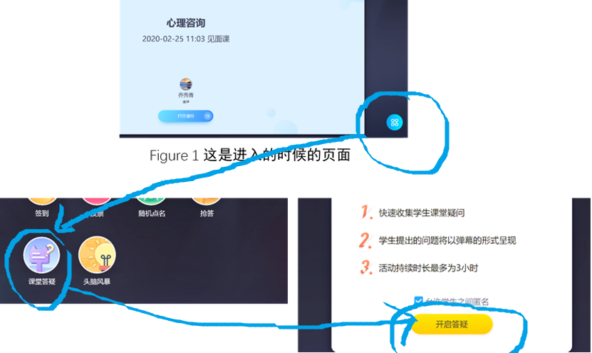 我操作了好几遍才发现怎么开弹幕的。下图是开弹幕的方法。进入之后点击上图右下角的蓝色“田”字图标。把下图的这个课堂答疑点开,一上课就点开,开启答疑,然后学生在你上课的时候就可以刷弹幕了。(个人觉得,有了弹幕环节,和学生的距离更近了,我与网红之间的距离也更近了。)