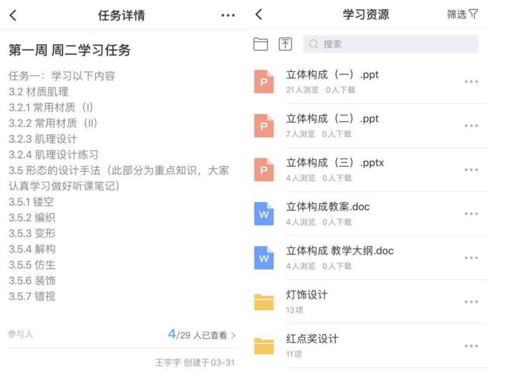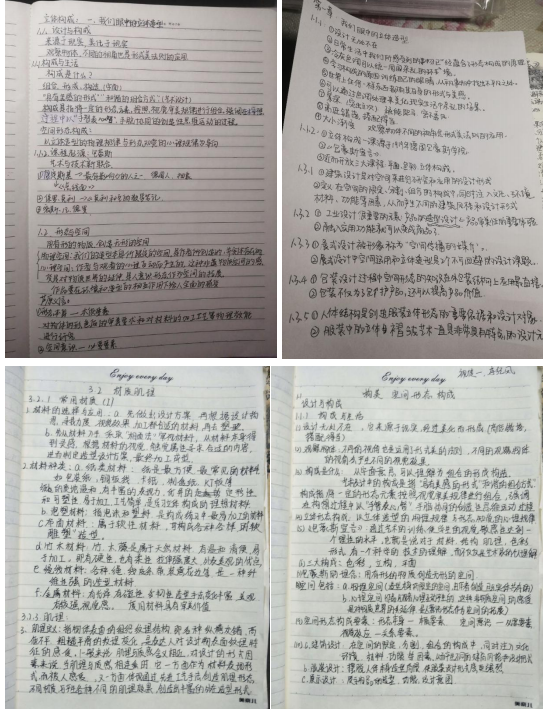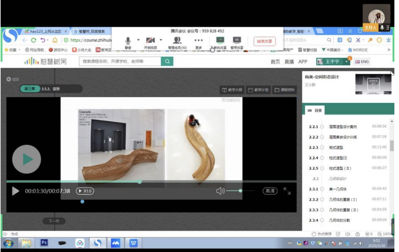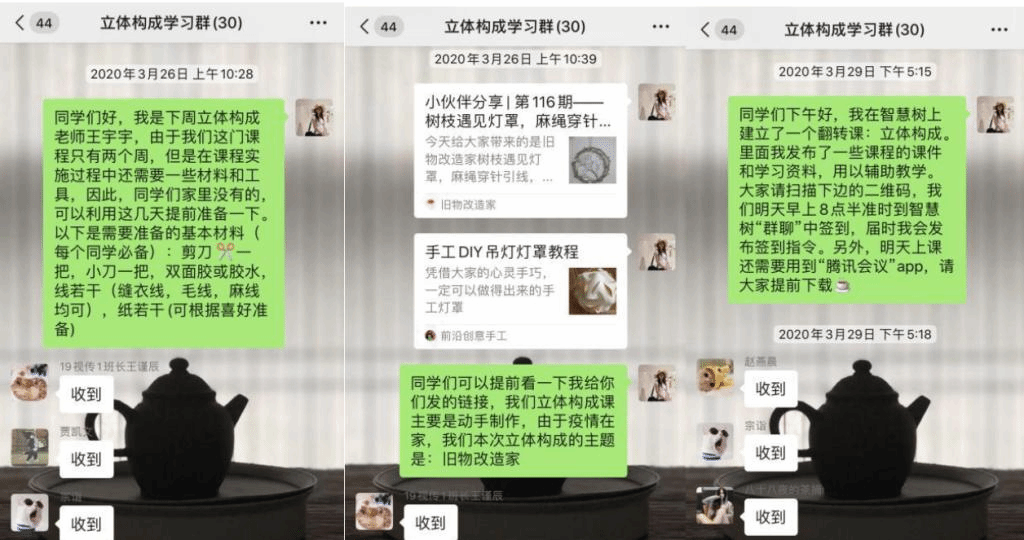 3、在上课方式上面我采用智慧树共享课视频和腾讯会议直播结合的方式进行。我提前为学生选了一门国家精品课程《构美——空间形态设计》,这门共享课程对于立体构成这门课知识点的讲解十分全面,并且详略得当,每个视频的长短在10分钟左右,比较合理。学生在线上进行观看视频学习,并要求学生在观看的同时做好学习笔记,并把每天的学习笔记发给我,以便用来检查同学们的学习效果。