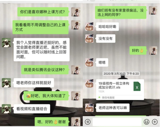 鉴于此,在教学之余,我从班里随机挑选了几位学生,通过微信聊天方式,向学生征求此课程的上课方式是否合理,听取学生们的意见,经过几位学生的反馈,收到了学生们较高的评价,因此更加坚定了我对于这本课程的教学信念。另外,向同学们询问班级里是否有家庭困难和住所比较偏远无法上网课的同学,如果有的话我会针对个别学生制定特别的教学计划和方式。