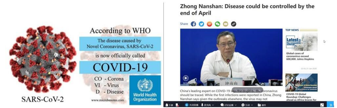 疫情期间,居家的学生们会接收到各种有关疫情的信息,这些信息鱼龙混杂,甚至不乏谣言,大大增加了学生们的焦虑情绪。大学英语线上课堂选择了讲解疫情相关词汇,播放钟南山对新冠肺炎的英语访谈,力求从科普的角度说明病毒的传播途径及防护方式,帮助学生远离不准确的“infodemic”(信息流行病),减少恐慌,保持积极乐观,做好自我防护工作,做到科学防疫。