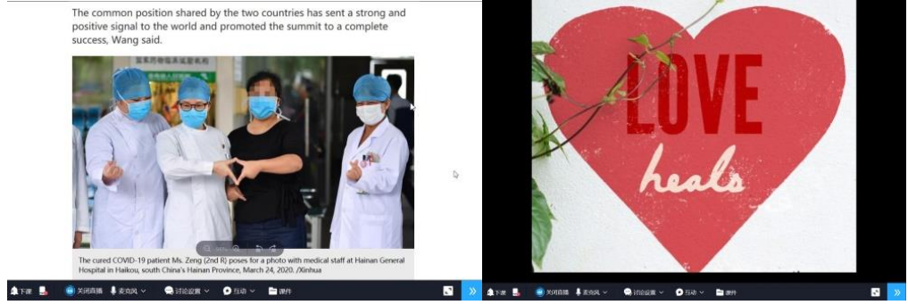 为了将课程思政有效的融入疫情期间的线上课堂,大学英语教师们从教学设计、情感教学以及师生互动入手,充分结合本学期的教学内容,运用丰富的线上课堂活动,引导学生切身体会、用心感受,用英语讲述战“疫”的中国故事,用英语发出战“疫”的中国声音,提炼传递“必胜”的信心和力量。