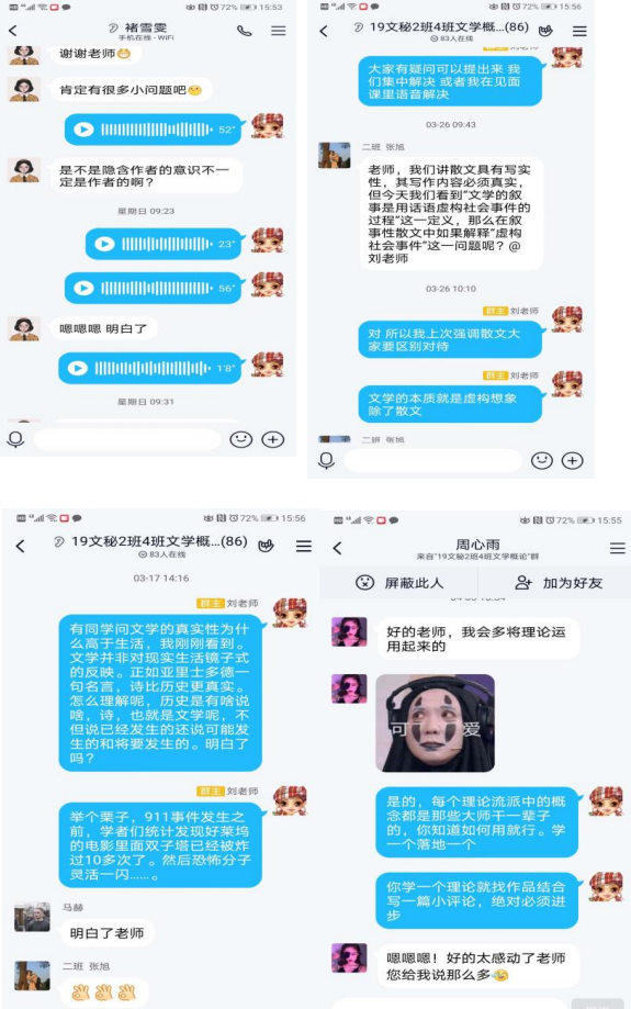 创建 QQ 课程群,实现课内课外结合 为了实现与学生及时沟通,创建了学生课程 QQ 群。每次上课前,提前做好预报。 多种平台的运用也较好地保障了个别软件网络拥堵状态下也能顺利开展正常教学。同 时,鼓励学生课下有疑必问,老师做到有问必答。部分同学拿自己的文学评论习作请老师指导,进步明显,有效实现了课内课外的衔接互补。