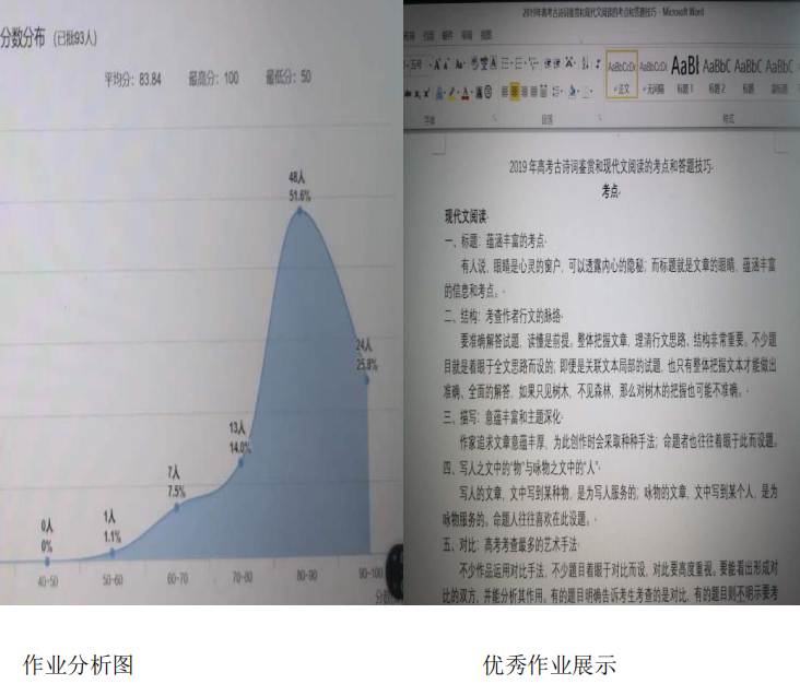二是建立翻转课堂。通过见面课功能实现课堂直播和互动,教师知识引导深入浅 出,与学生通过问题答疑、抢答等方式实现互动,遵循了学生的学习需求、接受状态 和学习习惯;通过下达学习任务、上传学习资源、作业布置等其它功能,实现课堂知 识的融会贯通,通过个性化、多样化的方法体系,得到同学们的认可。如本周的作业 为运用本周学习的文学体裁知识,掌握各类文体的特点,回顾 2019 年高考试题的古 诗词和文学类现代文阅读理解,并对考点和答题技巧进行总结。