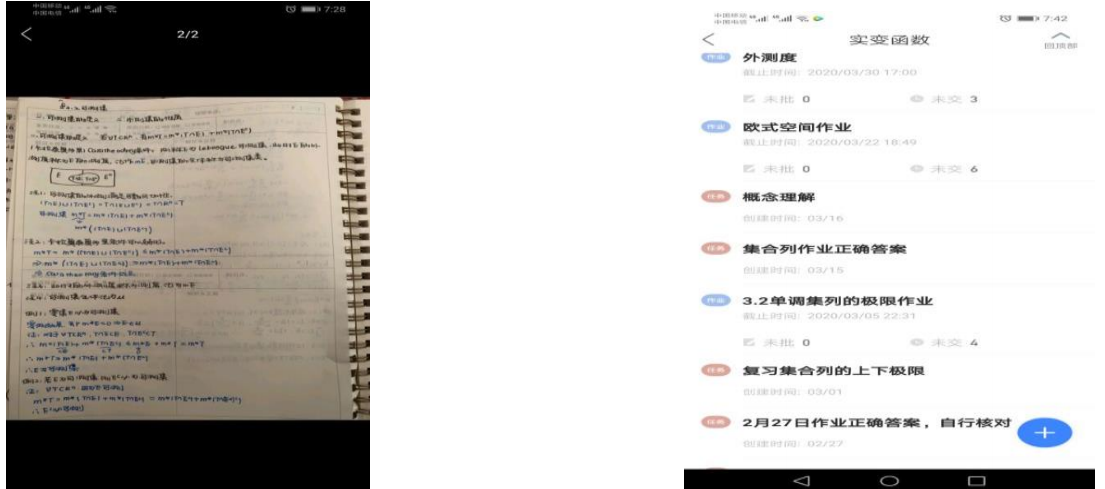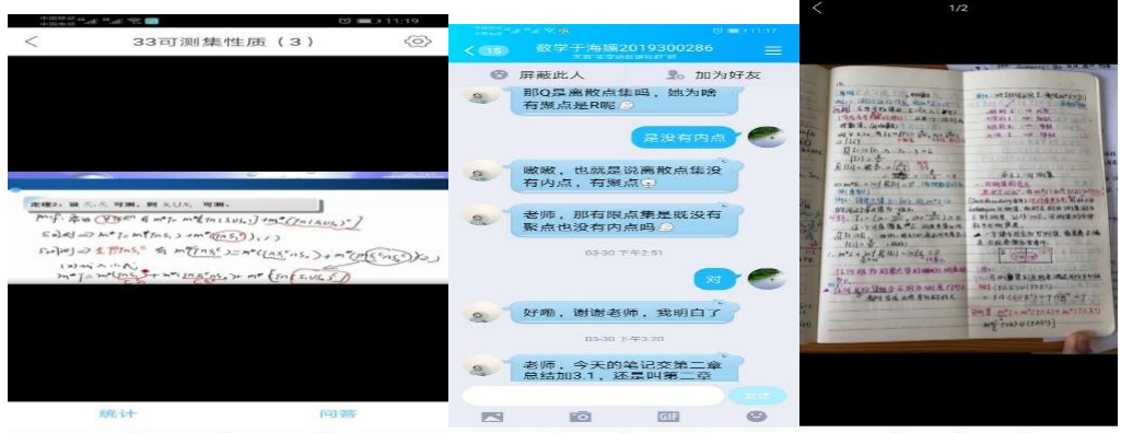 课堂上共同学习老师录制的教学视频,刚开始老师根据 ppt 课件内容讲解,由于《实变函数》这门课程是抽象性极高的一门数学理论课程,只随课件讲解是远远不够。后来在学院院长的建议下,购买了手写板,结合课件在一定程度上达到课堂板书的效果。学生反映这样效果会更好。课堂上会给学生们答疑、会提问某些问题,达到与学生的互动,督促学生们记笔记,保证学生的学习效率。