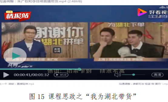 又如,选取以央视与淘宝平台合作为代表的“我为湖北带货”公益活动,通过对央视主播转变语言风格和呈现形式等现象的分析,既提醒学生继续做好个人防护,关注我国疫情防控相关新闻,关心社会公益活动,又充分论证课程产品-沟通组合中的“产品延伸,沟通调整”策略。
