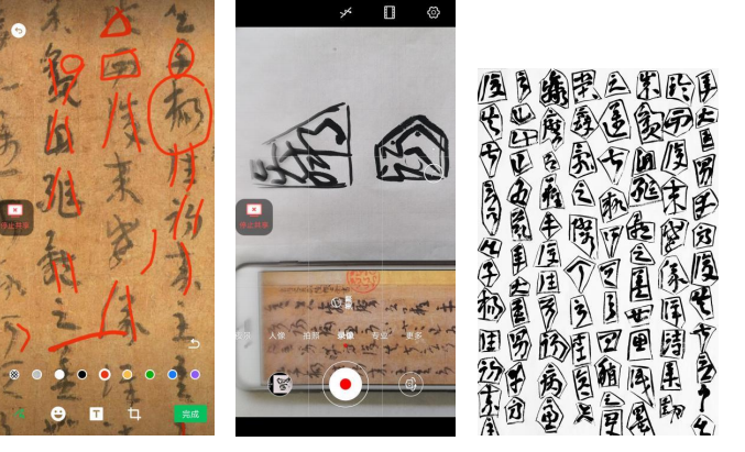 3.借助学习 APP 中的拍照比对功能,学生自我检测临摹的准确性。对于学生临摹作业准确性的评价是线上教学的一个重点和难点。在学习软件中有这样的一个功能,可以把学生的作业进行拍照,与原碑帖的字进行对比,发现其中的问题。