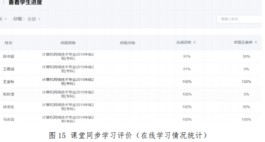 对学生进行学习评价是教学过程的重要环节,线上教学也不例外。考虑这种学习方式的特殊性,学习评价分为课堂同步学习评价及课后学习效果评价。课堂同步学习评价主要考虑学生的签到情况——有误迟到早退旷课现象以及在线学习时长数据(见图 15),确保按教学进度完成每一次课的学习任务。