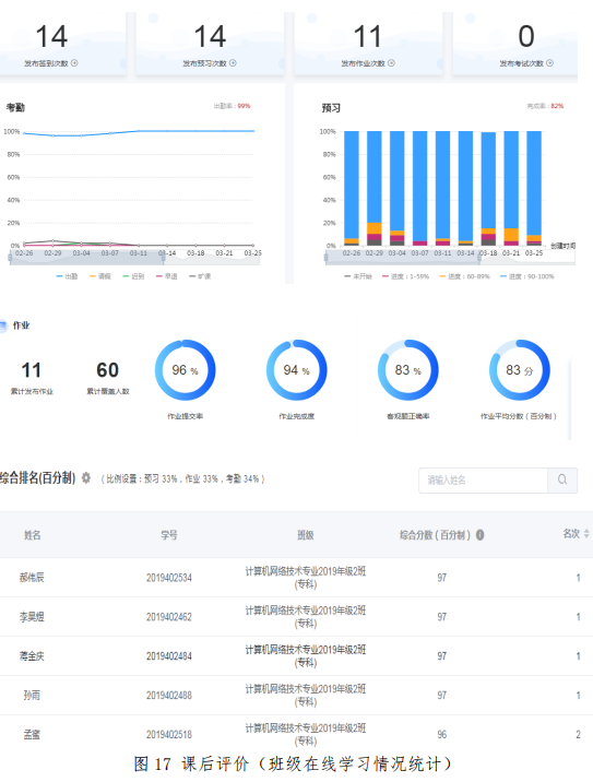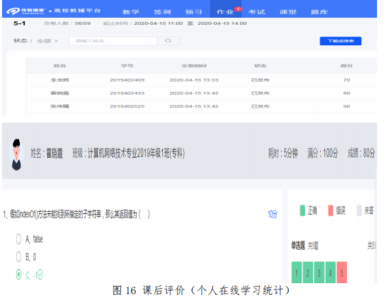 课后学习评价主要包括随堂测验和课后作业的完成情况以及随堂测验和课后作业成绩。每节课老师都会布置相应的随堂测验和课后作业,学生需在指定的时间内完成并上交,由教师作出评价。教师可通过后台数据汇总查看每一位同学的分数,方便掌握学生的学习效果及需要补充讲解的内容(见图16)。同时也可以通过后台数据汇总掌握班级整体学习情况(见图17)。