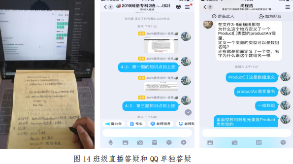 老师在收集整理后进行统计分析,并将问题分类汇总,按优先级9排序,对提出的问题通过QQ群课堂进行直播讲解。在直播课前,先在QQ群里分享问题所涉及的知识点,让学生对直播内容做到心中有数。对于个别性的问题,单独与学生QQ沟通解决(见图14)。这一方法的运用,使得教师可以动态掌握学生的学习情况,学生也有了问题解决的出口,有效的弥补了在线视频学习的不足。