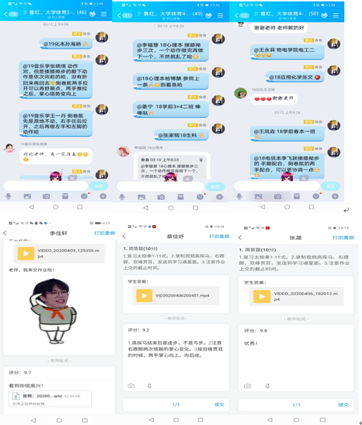 逐一认真批改同学们的课后作业,指出学生在练习中存在的问题,便于掌握学生对所学知识地掌握与运用。针对学生的作业情况,发放在学习通的视频里面有专门针对作业完成情况纠错讲解,使学生课上、课下相结合,有助于学生正确、熟练地掌握动作,增强学生学习的积极性,认真完成学习任务。