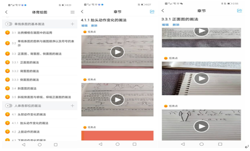 《体育绘图》的学习方法需要学生在掌握理论知识的基础上多加练习才能掌握体育动作图的画法。所以,前面几节课在学习通里面运用教学示范包进行教学,便于学生掌握体育绘图的基本理论知识。在画图阶段,一是借助教学示范包的教学视频,二是我根据教材的内容,自己先录制一份视频,放在学习通的章节教学内,学生根据视频讲解学习各种图形的画法。