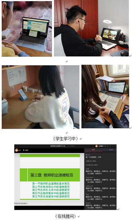 课程模式:在线直播课堂。自主建设《教师职业道德》翻转课,在翻转课内发布学习材料、学习任务、课堂作业。使用智慧树数字教学工具或腾讯课堂开通见面课直播教学通道。课下提供学习资源供学生自主学习。建立QQ组织教学讨论答疑,建立微信群,通过QQ和微信群保持日常教学管理和联系。