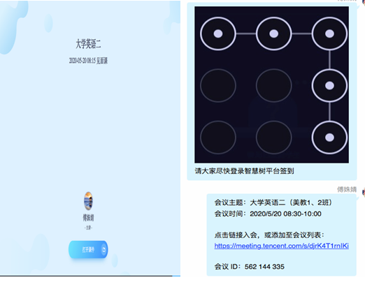提前15分钟登录智慧树平台,打开需共享的各项资源,开启见面课。发布手势签到并进行腾讯会议邀请。