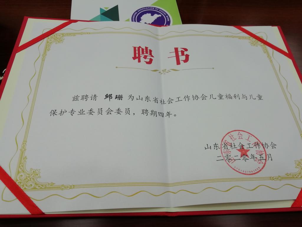 金年会官网邱珊副教授受聘山东省社工协会儿童福利与儿童保护专委会委员