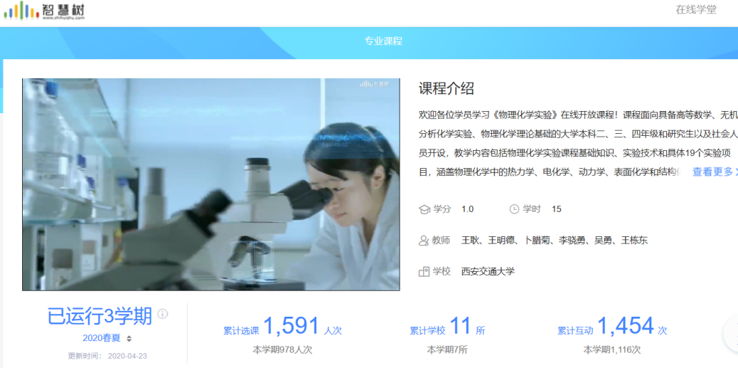 西安交通大学建设的物理化学实验在线课程,成熟运行多个学期。选用的学校多,选用的学生多,互动人次多,开设的实验项目多,这是我们选择共享课要考虑的几个原因。
