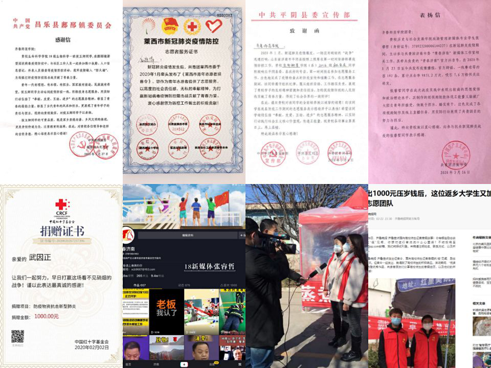 在疫情暴发期,作为志愿者,侯玉清参与社区疫情防控,负责排查并登记信息,志愿服务得到镇政府的认可,昌乐县鄌郚镇委员会向学校致感谢信,表扬她用实际行动弘扬了“奉献、友爱、互助、进步”的志愿服务精神。