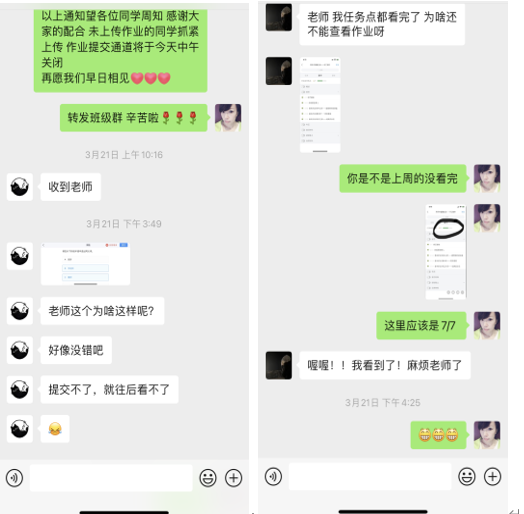 学生线上学习期间,任课教师随时查看线上课程学习数据,对于未完成学习任务的学生及时进行个别沟通,对于学习过程中学生遇到的困难及时反馈,对于学生提出的问题认真解答。