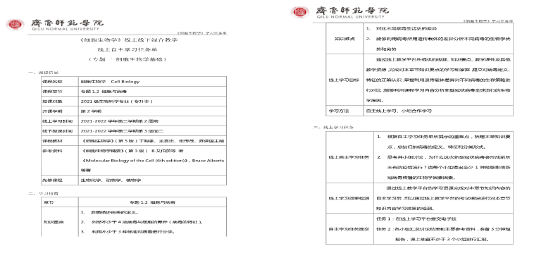 1.学生自主学习:学生利用课程团队自主建设的线上课程《分子细胞生物学》,依照《学生自主学习任务单》的提示和要求进行自主学习,并完成自主学习任务单中设定的各项学习任务;自主学习任务1和学习情况反馈在线上讨论前反馈给任课教师。
