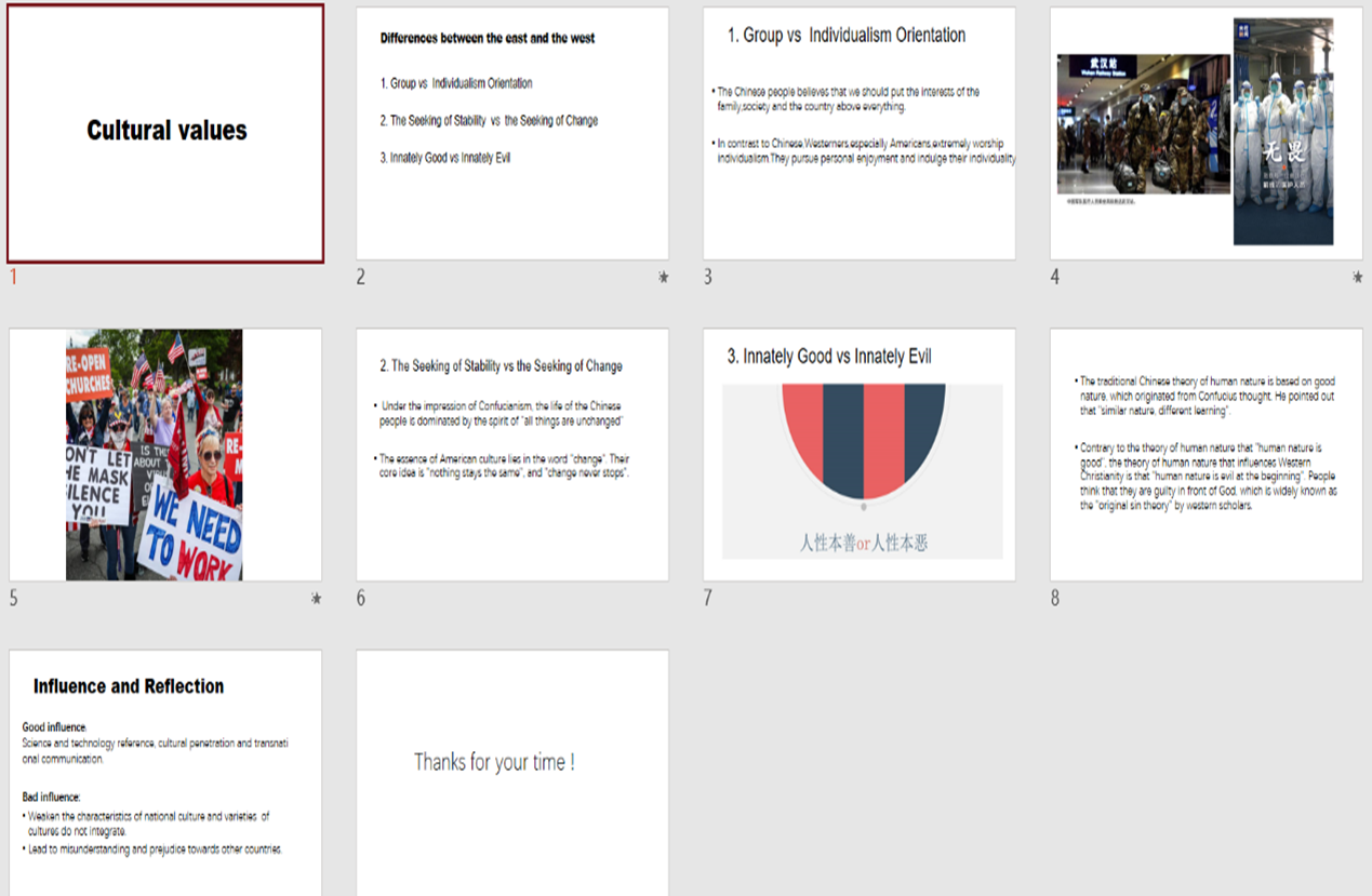 以小组为单位进行针对本组汇报展示话题的研讨实践活动,每组选出学生代表进行小组研讨成果汇报,与其他同学进行交流与分享。本学期,此项学习活动目前已完成组队,各组还在准备过程中。以下为上一轮次的学生展示汇报: