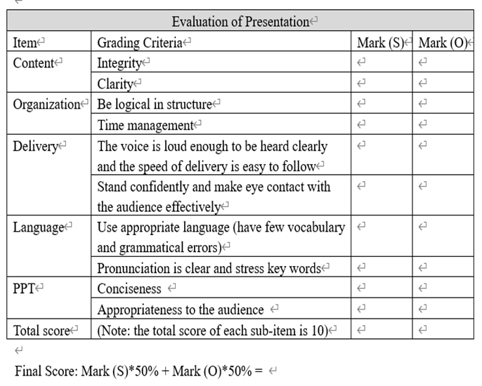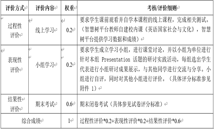 针对课程目标3评价与考核除期末考试外,主要通过小组自评和互评相结合的表现性评价和考核。