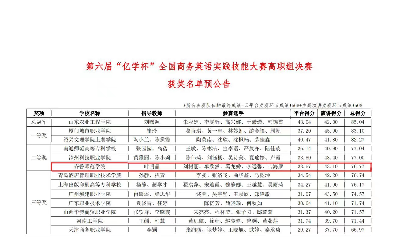 10月22日,第六届“亿学杯”全国商务英语实践技能大赛高职组决赛落下帷幕,外国语学院叶明晶老师指导的商务英语专科团队取得全国二等奖的优异成绩。