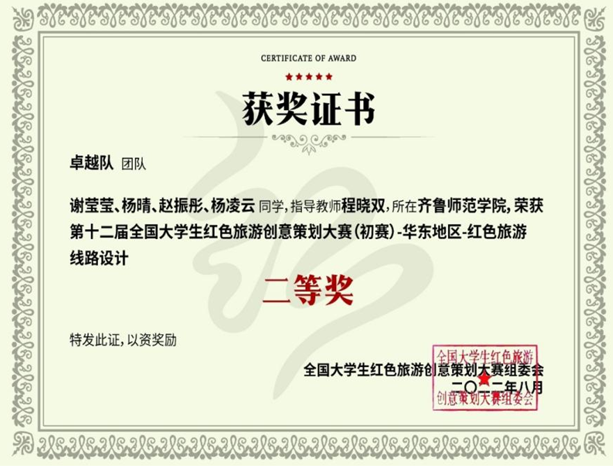 金年会官网学生获第十二届全国大学生红色旅游创意策划大赛华东地区二等奖
