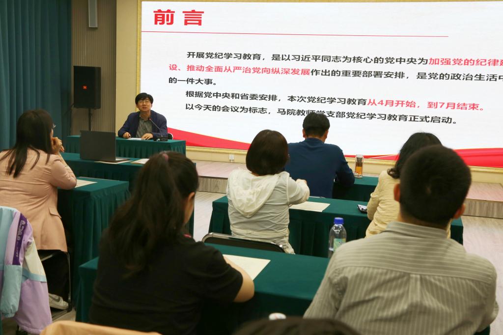 期间,学院各党支部召开党纪学习教育部署会,党委书记贾龙为全体党员作了题为《深入开展党纪学习教育保障马院高质量发展》的专题党课,要求全体党员深刻认识开展党纪学习教育的重要意义,切实把思想和行动统一到党中央决策部署上来,在学习贯彻纪律处分条例上下功夫求实效,并结合学院实际工作,对在教学、科研、人才培养、学生工作方面如何体现和加强政治纪律、组织纪律、廉洁纪律、群众纪律、工作纪律、生活纪律做了解读和安排,推动党纪学习教育融入日常、抓在经常。