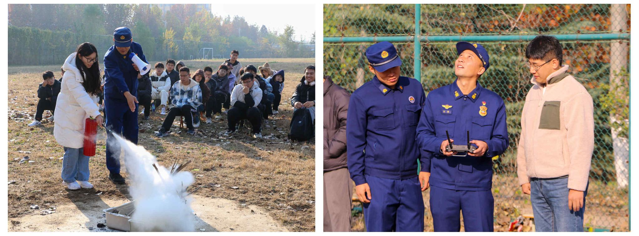为确保演练活动安全有序进行并取得实效,参演各部门高度重视,从演练内容、师生动员、物资保障、安全措施等多方面着手,精心策划,周密部署。上午9时,师生齐聚第二操场,章丘森林消防中队为师生们带来了消防知识宣讲和火灾模拟扑救演练。师生们在认真听讲和观摩后,在消防员的指导下学习并体验了灭火器的正确使用方法,同时在烟雾体验区内模拟练习逃生技能。不同于平常的演练,物理与电子工程学院无人机专业学子利用无人机灵活机动的优势和专业知识,操控无人机集群穿行长空,加入到本次的安全演练中。无人机群在众人惊讶的目光中,穿梭在“火海”中,实时将“火情”数据传回指挥中枢,协助消防人员评估火场状况,并精确地向火源投掷水球,顺利完成灭火任务,有效控制火势于初期阶段。现场工作人员表示,与传统的大型灭火设备相比,无人机群在进入复杂环境、执行精确灭火等方面具有明显优势,是初期火灾控制和降低消防人员风险的得力助手。