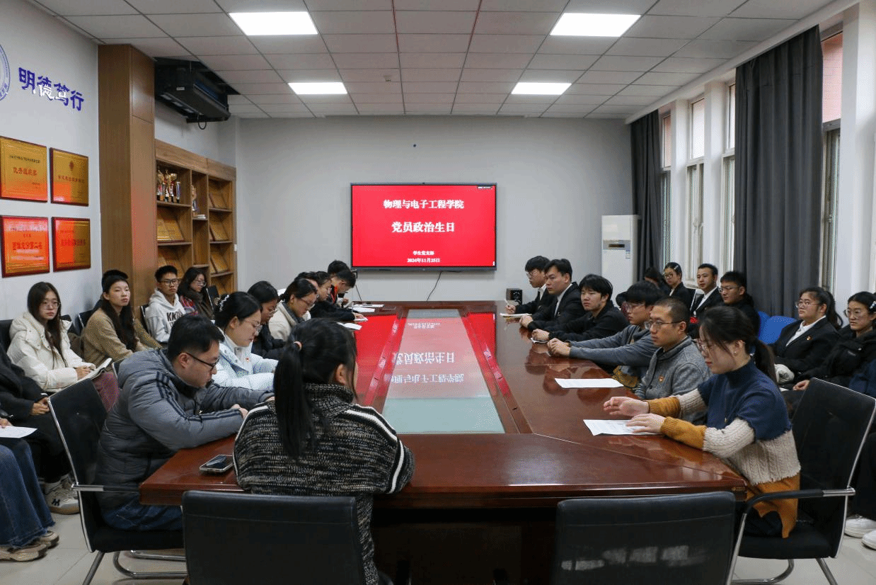 “政治生日”是指党员的入党之日,这不仅是党员入党的纪念日,更是每一位共产党人的信仰名片。为进一步强化党员政治意识、责任意识和担当意识,发挥党员先锋模范作用,促进基层党组织提升政治能力建设,结合学院“党员先锋月”活动,11月25日,物理与电子工程学院于二号实验楼B216为学院学生党员开展集体过“政治生日”活动。学院学生党支部书记张凤云、吕伟皓,辅导员徐爱林、冯贺禾、郭婵以及全体学生党员参加。