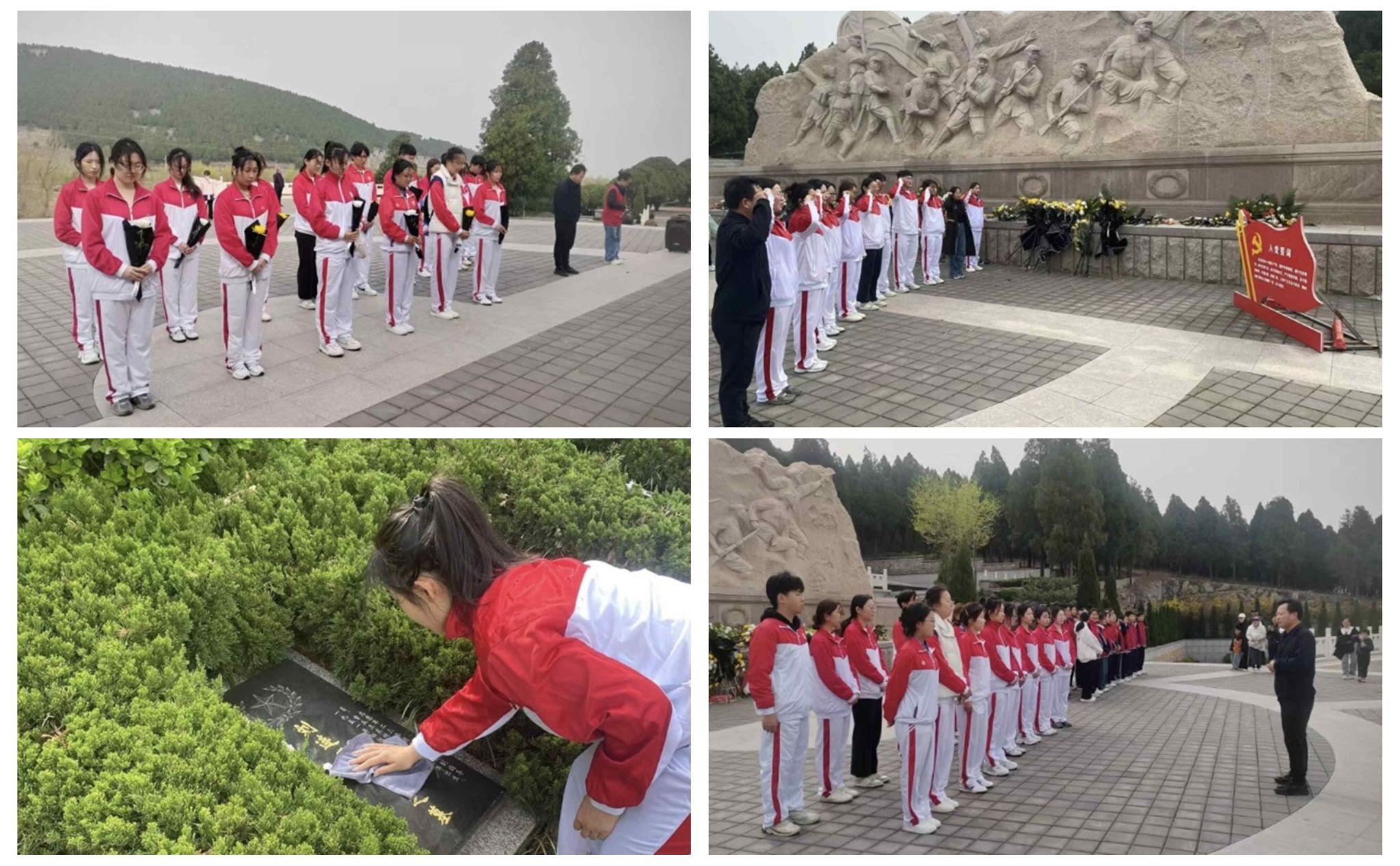 青山静默,忠骨无声。烈士陵园内,革命烈士纪念碑巍然屹立。在纪念碑前,大家整齐列队,面向纪念碑肃立,表达对革命先烈的无限敬仰。学生们依次上前敬献鲜花,一束束鲜花寄托着对英烈的缅怀与追思,也象征着红色精神的代代相传。随后,全体人员低头默哀,在静默中缅怀先烈们为国家和人民所做出的巨大牺牲。默哀结束后,全体党员面向党旗,庄严地重温入党誓词。“我志愿加入中国共产党,拥护党的纲领……”铿锵有力的誓言在陵园上空回荡,每一句誓言都饱含着学生党员们对党的无限忠诚和对革命事业的坚定信念。