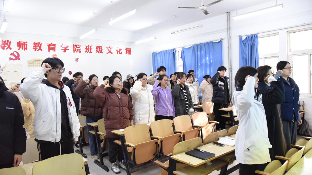 为增强共青团员对团组织的认同感和归属感,切实增强团员的先进性和光荣感,11月16日,文学与历史文化学院在二号教学楼A313教室举行了庄严隆重的新团员入团宣誓仪式。学院团总支书记吕闻佩主持仪式,团总支副书记徐超,辅导员梁艳霞、刘冠群以及学院新入团的38名青年学生参加仪式。
