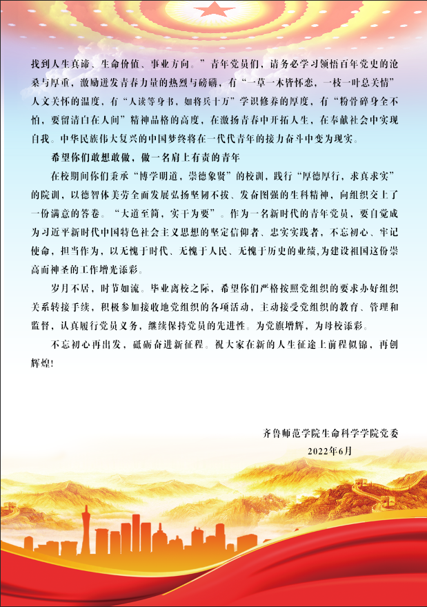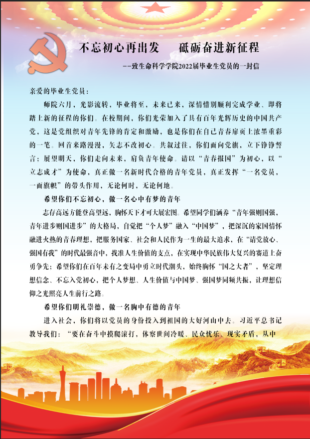 学生第一党支部宣传委员陆含宣读了生命科学学院党委致2022届毕业生党员的一封信。信中,充满了生命科学学院党委对全体毕业生党员的殷切期望,希望大家“不忘初心再出发,砥砺奋进新征程”,做一名心中有梦、胸中有德、肩上有责的青年,以“青春报国”为初心,以“立志成才”为使命,真正做一名新时代合格的青年党员,真正发挥“一名党员,一面旗帜”的带头作用,以青春之我、奋斗之我,为民族复兴铺路架桥,为祖国建设添砖加瓦。