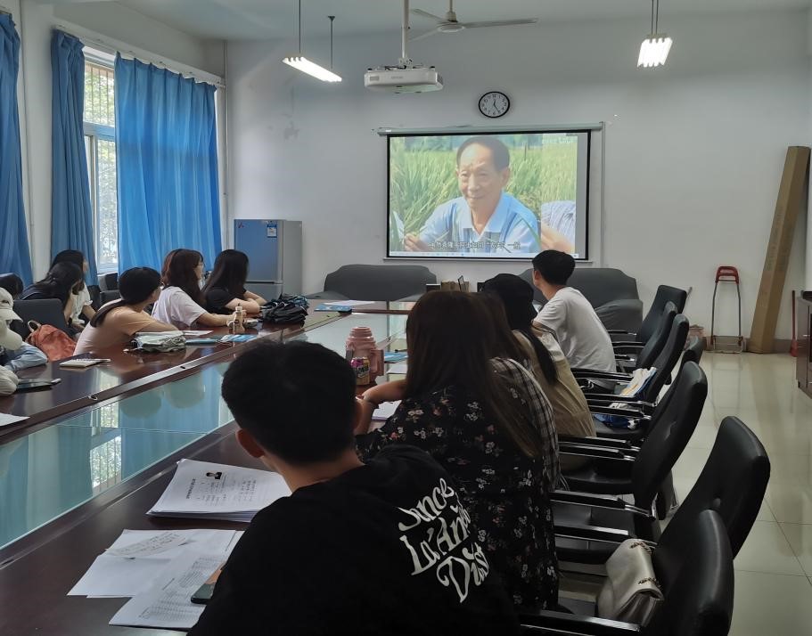 会议第一项,全体毕业生党员集中观看了中国杂交水稻之父—袁隆平院士的纪录片,以此纪念逝世的袁隆平院士。在纪录片中,袁隆平院士曾说到自己有两个梦想,一个是“禾下乘凉梦”,一个是“覆盖全球梦”,袁老执着追梦的精神令在座不少党员都红了眼眶。袁老身上对于科研事业的不懈探索与追求,也是青年学子应当坚持的品质。