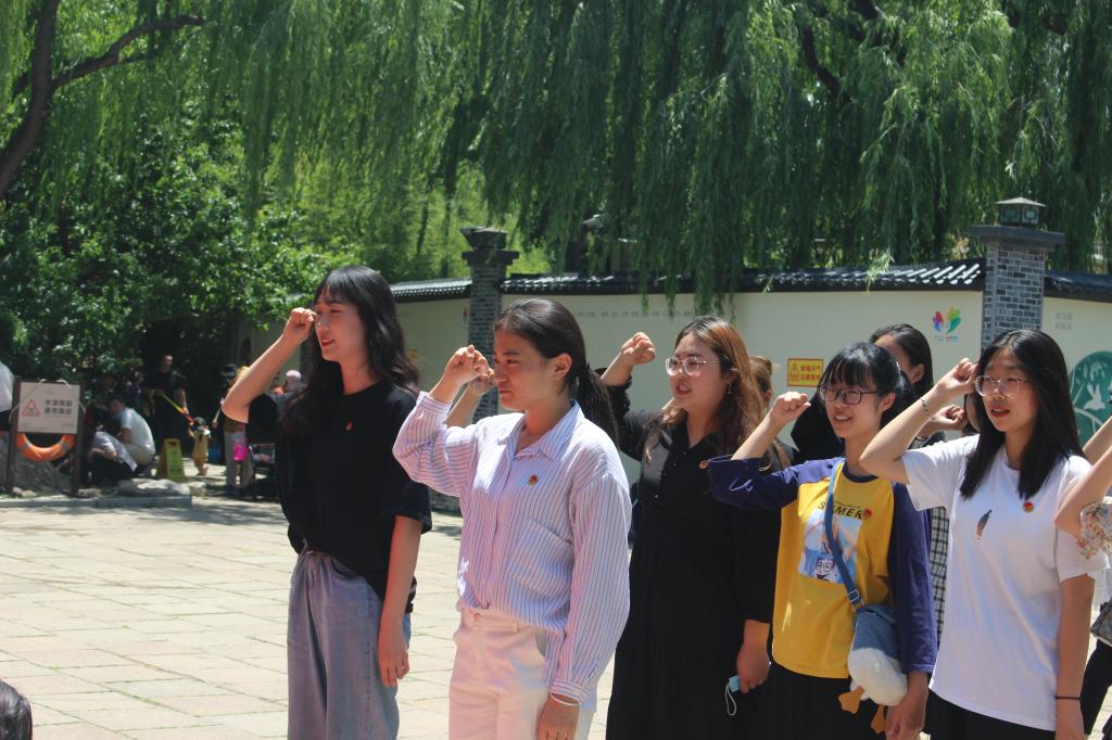 在两位初代共产党人的雕像面前,团支部全体成员对着鲜艳的团旗,高举右拳,庄严宣誓:“我志愿加入中国共产主义青年团,坚决拥护中国共产党的领导,遵守团的章程,执行团的决议……”铿锵有力的誓词回荡在每一位团员耳畔,增强了同学们作为共青团员的荣誉感、责任感、使命感。最后向两位先烈的雕像鞠躬,致以深深的缅怀和敬意。