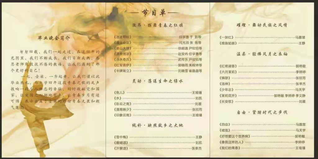 相聚在九月,分离于六月。仿佛总是伴随着炽热的阳光、湿热的雨水,就如毕业生们四年里的际遇,热烈、明媚、璀璨,自我成长、自我进步,同时又在学校和老师的带领下受到滋润、教化和洗礼。我们爱国,所以激昂;我们敬业,所以灵动;我们诚信,所以纯朴;我们友善,所以温柔;我们亦是自由的、璀璨的,因为我们是新时代的青年,舞动着的,是为党而高举着的鲜艳红旗!