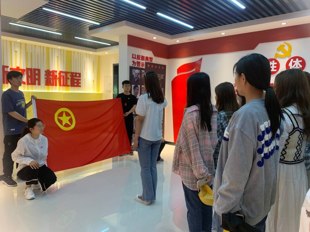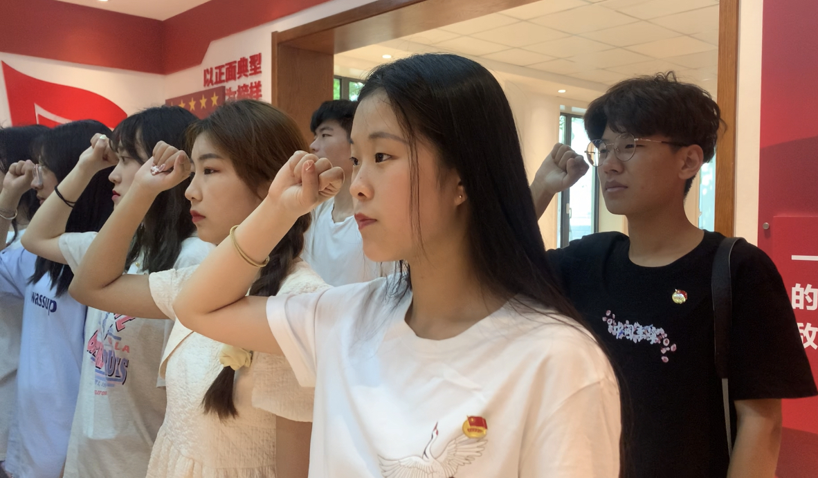 最后,在这浓厚的党史学习氛围中,2019级药品生产技术三班团支部在团旗下重温入团誓词,全体团员高举右拳,在鲜艳的团旗下庄严宣誓:“我志愿加入中国共产主义青年团......”铿锵有力的誓词回荡在现场每一位团员心中。