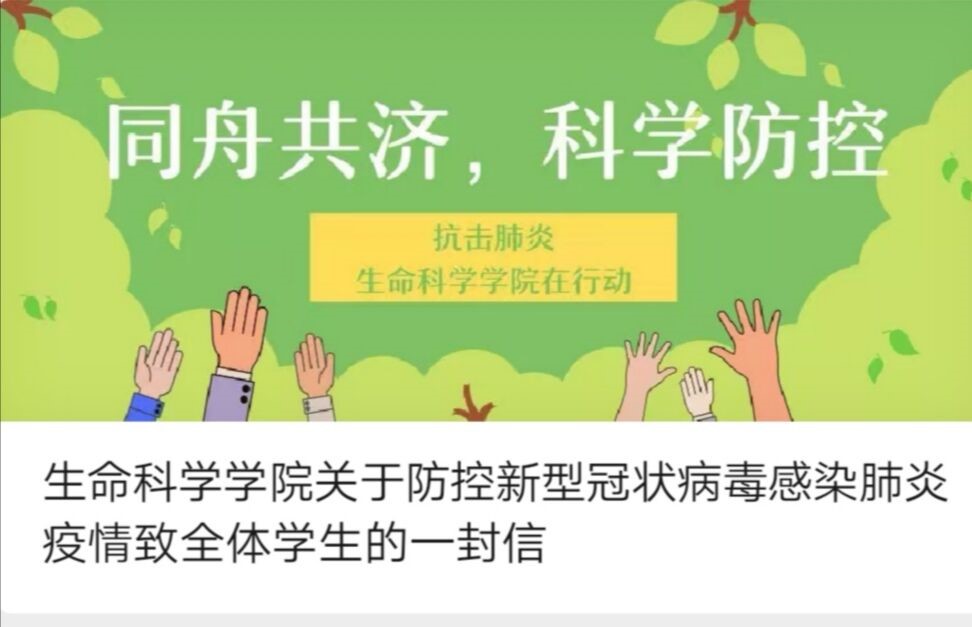 自疫情发生后,生科院学生党支部号召全体学生党员深入学习贯彻习近平总书记坚定信心、同舟共济、科学防治、精准施策的总要求,学生党支部书记张宏熙老师牵头发出了《生命科学学院关于防控新型冠状病毒感染肺炎疫情致全体学生的一封信》,热情洋溢, 鼓舞士气,又充满真情关切,号召全体生科学子认真学习掌握新型冠状病毒感染肺炎的相关预防知识及注意事项,切实增强防范意识;面对疫情,要保持理性思考,不信谣、不传谣,尽己所能,用实际行动维护大局,弘扬青春正能量,做新时代具有远大理想和责任意识的爱国者;号召各位学生党员及学生干部要积极投身于积极防控之中,发挥先锋模范作用。