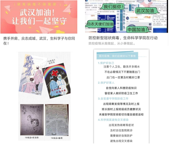 疫情发生后,部分学生党员、共青团员主动承担了学院疫情防控的宣传工作。他们发挥专业优势,做好疫情防控的“宣传员”,充分发挥脚力、眼力、脑力、笔力,利用微博、微信公众号、QQ等新媒体平台,发布“生科院防疫知识普及”系列推送文章,加强对同学们疫情防控知识的教育和普及,潜移默化地引导广大青年科学防疫、抵制谣言,同时引导大家合理安排假期时间,制定好学习规划,确保学习“不断线”,学习成效有提升。
