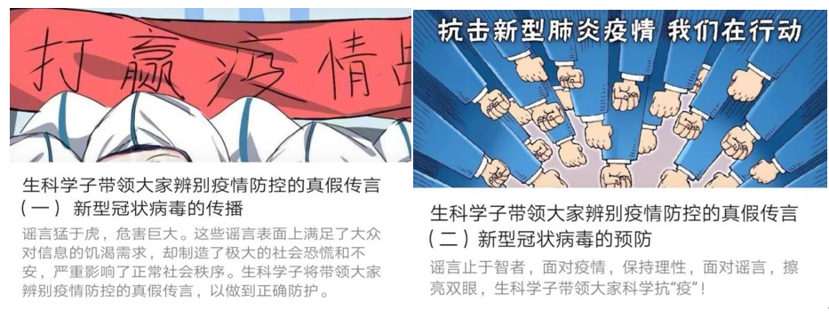 在全国人民共同抗击疫情的当下,各类“网传”“听说”类谣言信息误导公众,引发恐慌。为此,在学生党支部宣传委员祖群老师组织下,“宣传员们”总结近期热度较高的有关疫情防控的话题,利用专业知识,在微信公众号上发布《生科学子带领大家辨别疫情防控的真假传言》,号召全体青年面对疫情,不恐慌,能够保持科学理性的思考,不做疫情谣言的制造者和传播者。